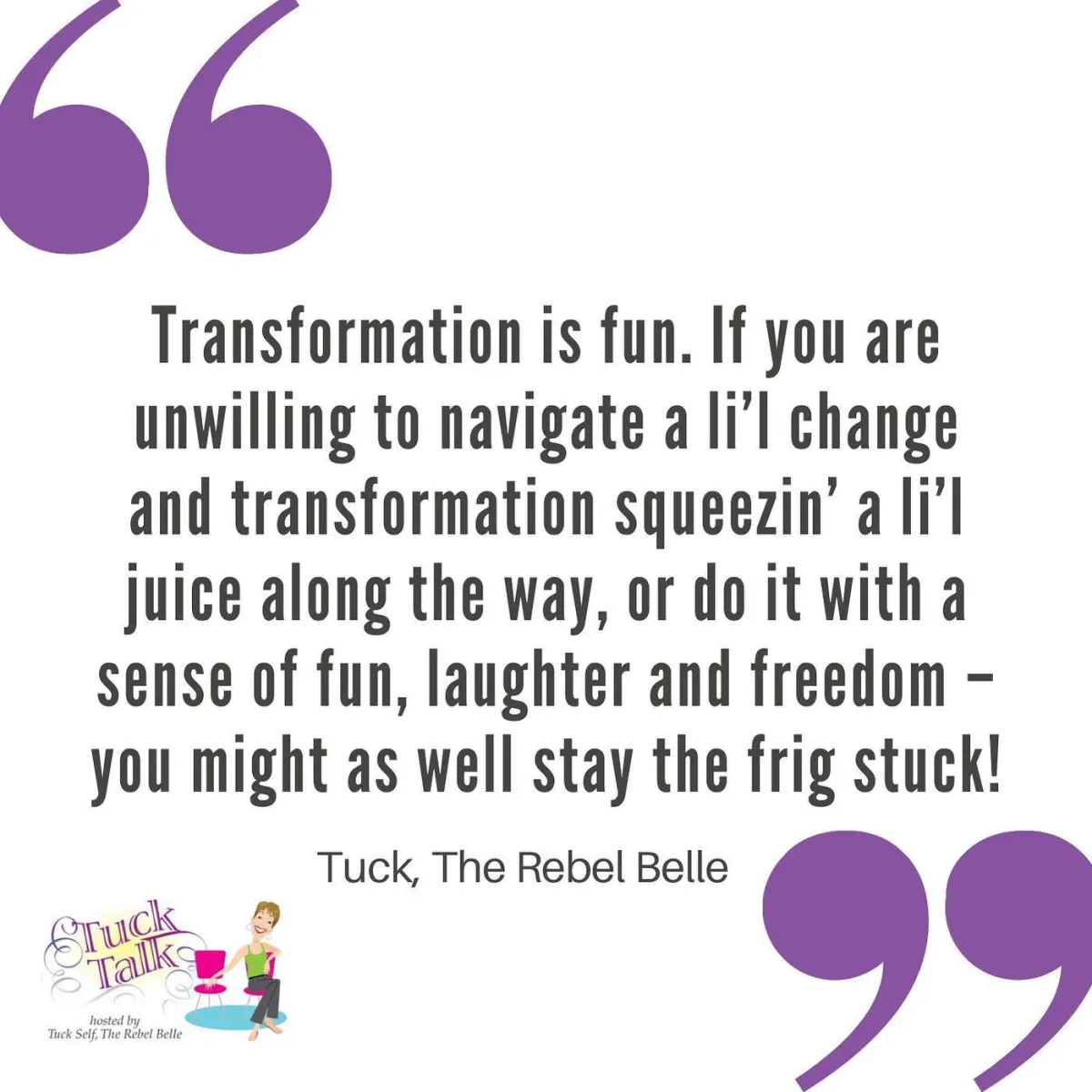With her self-effacing humor and the wisdom gained from a life time of experiences, Tuck entertains, challenges and inspires you out of the muck and mire of your mundane world and into your personal greatness.